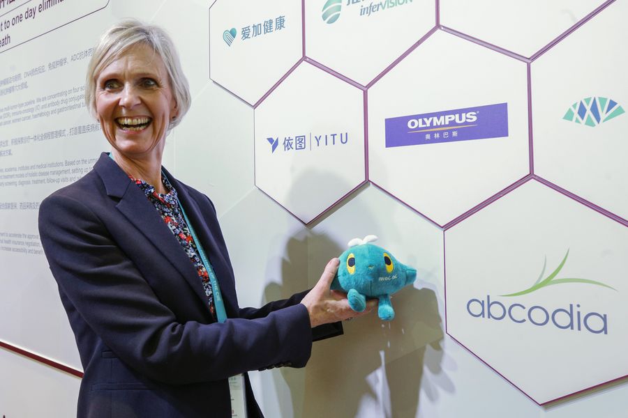 British exhibitor Julie Barnes poses for a photo next to her company logo during the second China International Import Expo (CIIE) in Shanghai, east China, Nov. 6, 2019. (Xinhua/Zhang Yuwei)