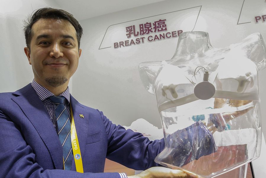 Daniel Ma, staff member of AstraZeneca, shows a bra used to screen breast cancer during the second China International Import Expo (CIIE) in Shanghai, east China, Nov. 6, 2019. (Xinhua/Zhang Yuwei)