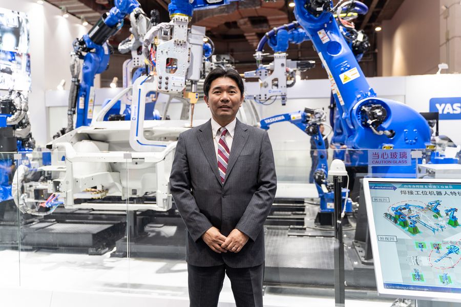 Hirota Hiroyasu of Yaskawa Electric (China) Co., Ltd, poses for a photo at the Equipment exhibition area during the second China International Import Expo (CIIE) in Shanghai, east China, Nov. 7, 2019. (Xinhua/Zhang Xiaoyu)