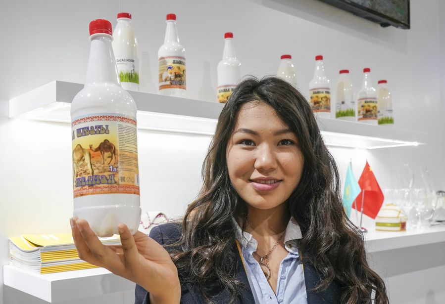 An employee shows a bottle of camel milk at the Kazakhstan pavilion during the second China International Import Expo (CIIE) in Shanghai, east China, Nov. 6, 2019. (Xinhua/Yin Gang)
