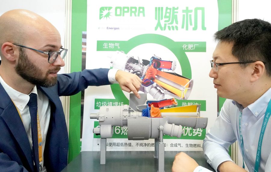 Matteo Bellemo (L) of Dutch manufacturer Opra Turbines introduces a gas turbine product to a Chinese businessman during the second China International Import Expo (CIIE) in Shanghai, east China, Nov. 6, 2019. (Xinhua/Chen Jianli)