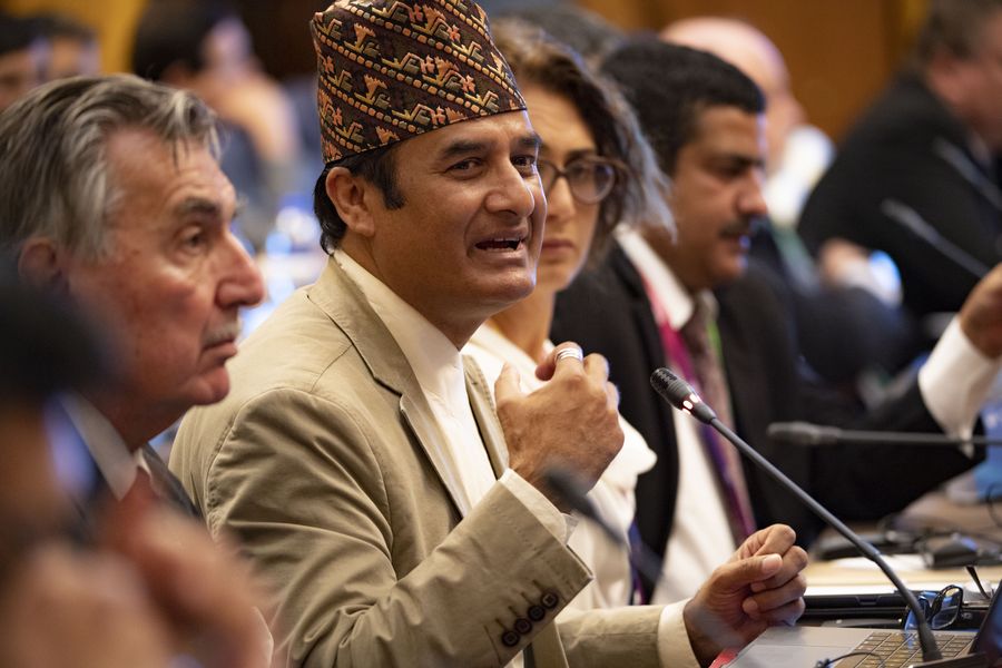 Mrigendra Bahadur Karki, executive director of Centre for Nepal and Asian Studies of Tribhuvan University in Nepal, speaks at a seminar on the topic "Multi-Path Exploration of Modernization" during the second Hongqiao International Economic Forum on China's 70-year Development and the Building of a Community with a Shared Future for Mankind held in Shanghai, east China, Nov. 6, 2019. (Xinhua/Purbu Zhaxi)