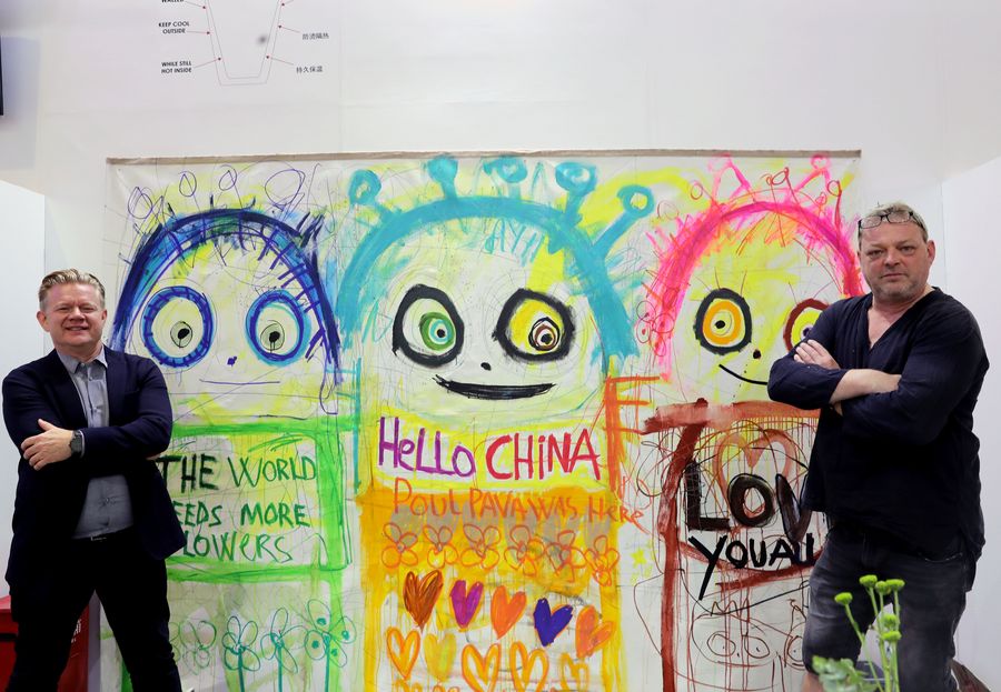 Artist Poul Pava (R) pose for photos with his drawings together with Peter Maae Jensend of Danish design house Aida during the second China International Import Expo (CIIE) in Shanghai, east China, Nov. 7, 2019. (Xinhua/Liu Ying)