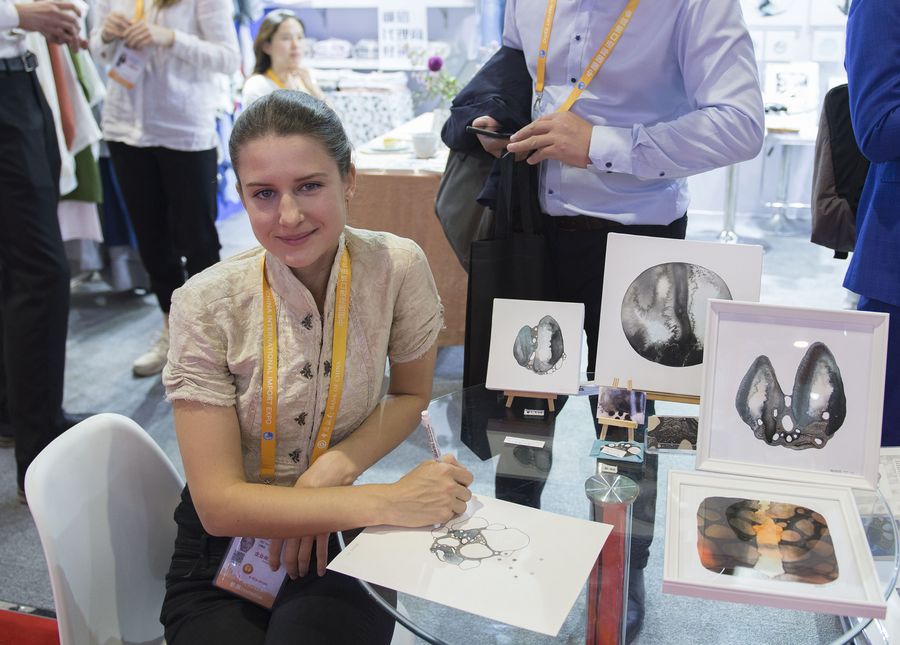 Diana Zabielaite, a visual artist from Lithuania, poses with her art works at the Lifestyles exhibition area during the second China International Import Expo (CIIE) in Shanghai, east China, Nov. 7, 2019. (Xinhua/Wang Siwei)