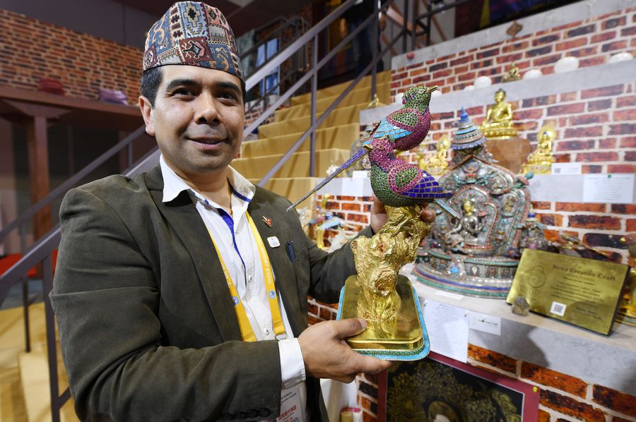 An exhibitor shows his works at the Nepal pavilion during the second China International Import Expo (CIIE) in Shanghai, east China, Nov. 6, 2019. (Xinhua/Fan Peishen)