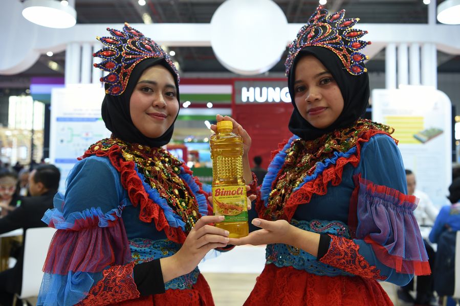 Staff members show palm oil products at the Indonesia pavilion during the second China International Import Expo (CIIE) in Shanghai, east China, Nov. 6, 2019. (Xinhua/Fan Peishen)