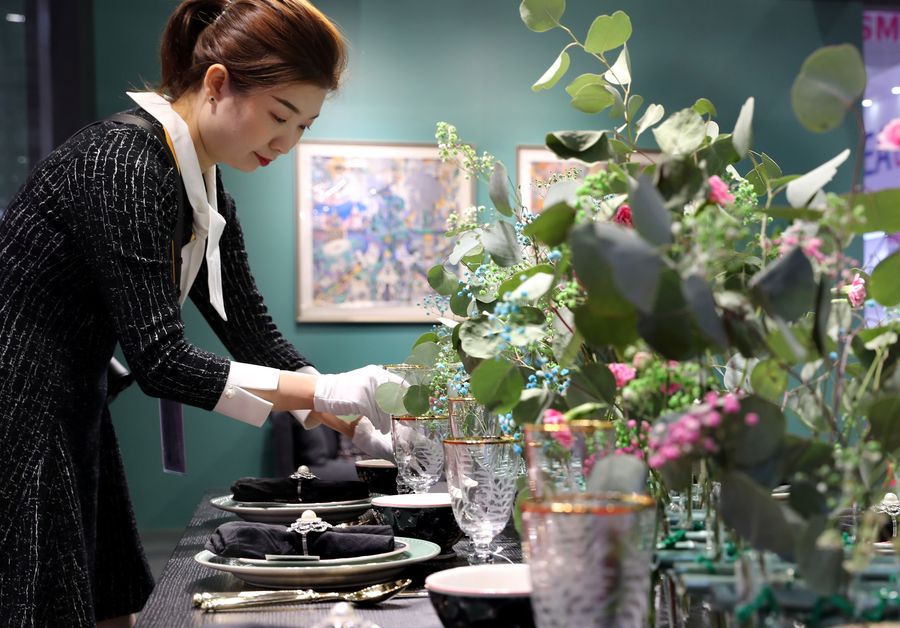 A staff member arranges GreenGate kitchenware from Denmark at the Lifestyles exhibition area during the second China International Import Expo (CIIE) in Shanghai, east China, Nov. 5, 2019. (Xinhua/Liu Ying)