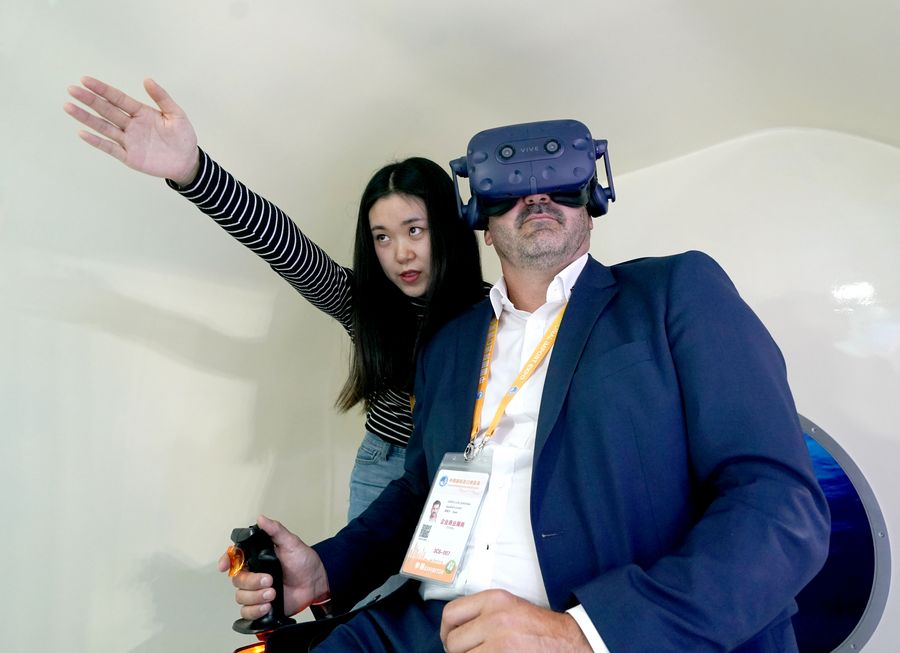 A Spanish exhibitor (R) operates in an experiencing cabin of manned submersible Shenhai Yongshi (Deep Sea Warrior) at the China pavilion during the second China International Import Expo (CIIE) in Shanghai, east China, Nov. 5, 2019. (Xinhua/Chen Jianli)