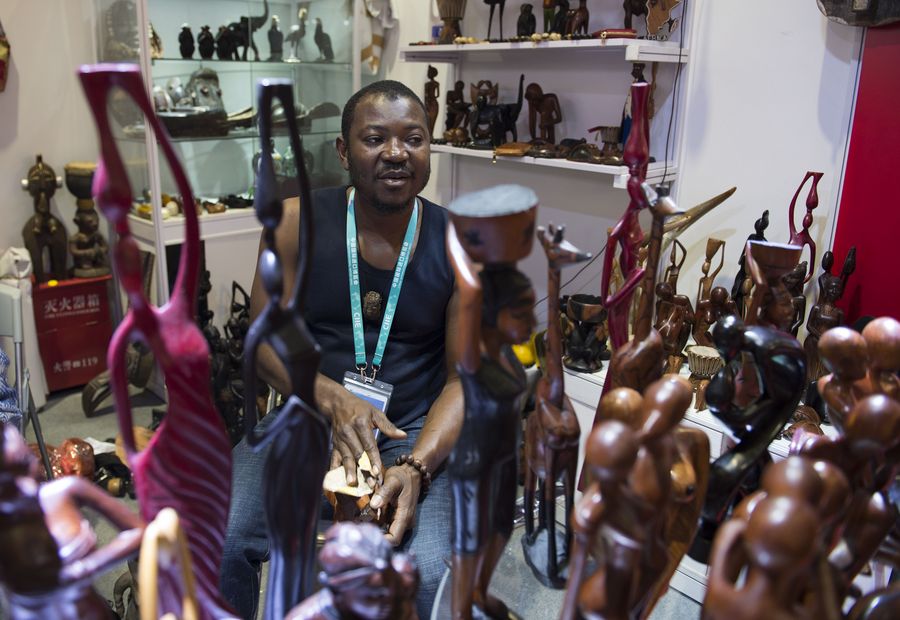 An exhibitor from Guinea prepares woodcarving products at the Lifestyles exhibition area during the second China International Import Expo (CIIE) in Shanghai, east China, Nov. 7, 2019. (Xinhua/Wang Siwei)