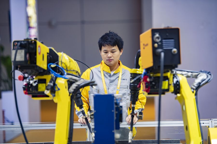 An employee checks a spot welding robot at the booth of Hugong International at the Equipment exhibition area during the second China International Import Expo (CIIE) in Shanghai, east China, Nov. 5, 2019. (Xinhua/Purbu Zhaxi)