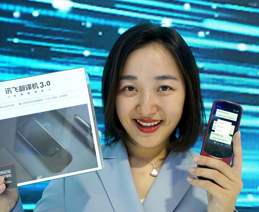 A staff member shows an iFLYTEK translator at the China pavilion during the second China International Import Expo (CIIE) in Shanghai, east China, Nov. 6, 2019. (Xinhua/Chen Jianli)