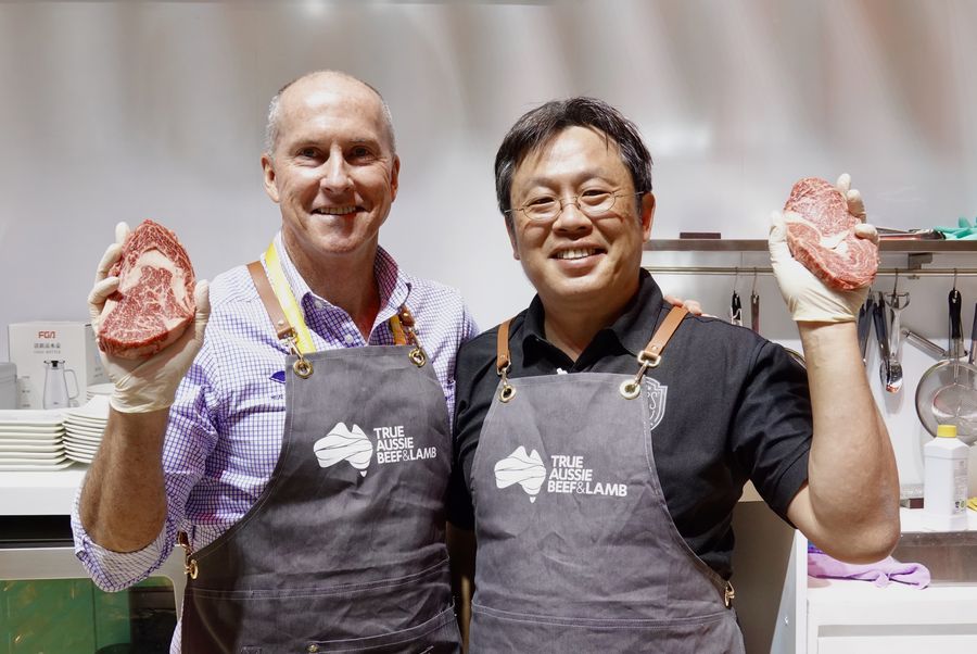 Staff members of Meat and Livestock Australia show beef slices during the second China International Import Expo (CIIE) in Shanghai, east China, Nov. 5, 2019. (Xinhua/Cai Yang)