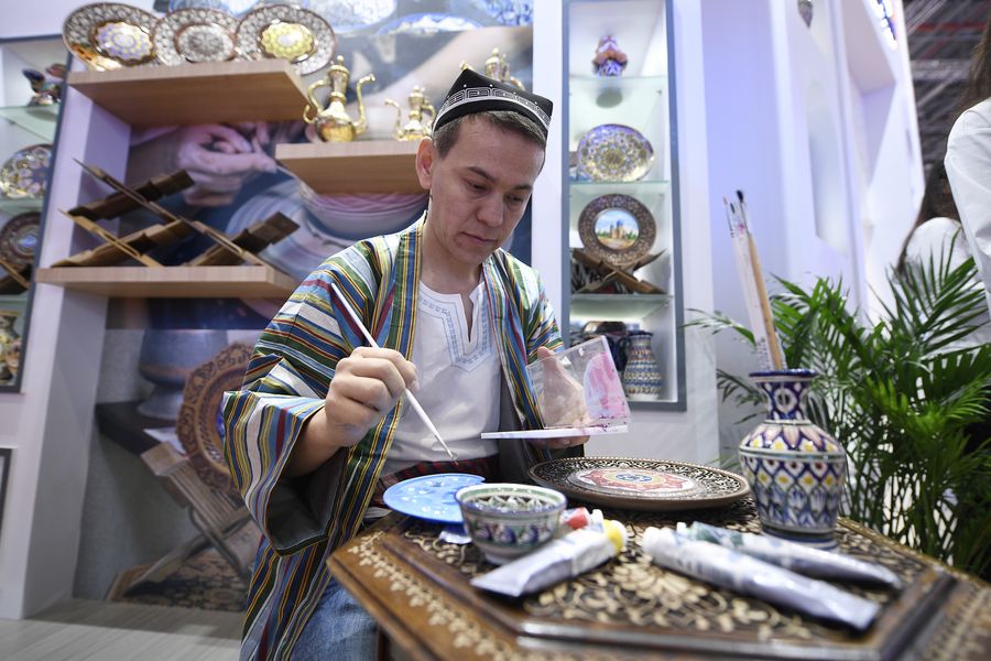 An artisan demonstrates traditional craft skills at the Uzbekistan pavilion during the second China International Import Expo (CIIE) in Shanghai, east China, Nov. 6, 2019. (Xinhua/Wang Peng)