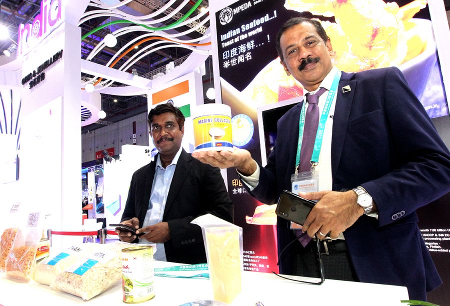 A staff member shows specialty food at the India pavilion during the second China International Import Expo (CIIE) in Shanghai, east China, Nov. 5, 2019. (Xinhua/Chen Fei)