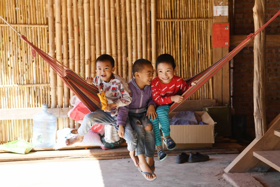 Children play outside the house in Hebian village group in Mengban Town of Mengla County, southwest China's Yunnan Province, Nov. 16, 2019. (Xinhua/Yang Zongyou)