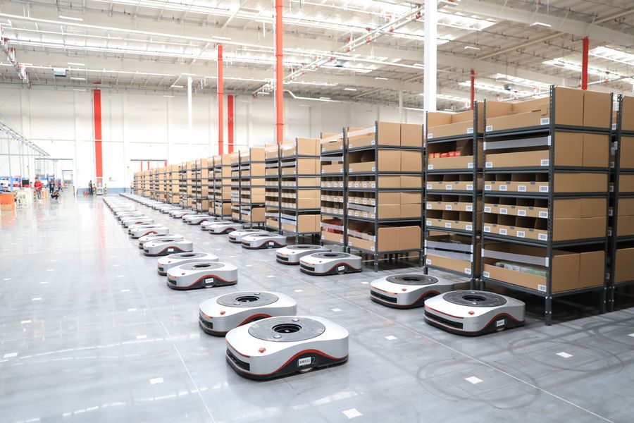 Photo taken on April 12, 2019 shows delivery robots in the China's online retailer giant JD.com's "Asia No.1" smart logistics center in Shenyang, capital of northeast China's Liaoning Province. (Xinhua)