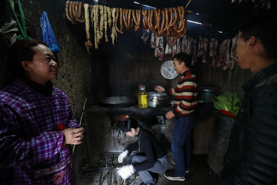Tourists visit a house of a villager in Atulie'er Village, Zhaojue County, Nov. 24, 2019. (Xinhua/Wang Xi)