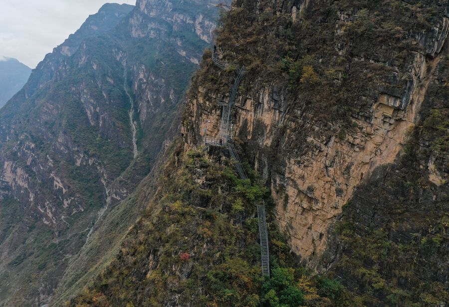 Aerial photo taken on Nov. 23, 2019 shows a steel ladder built along the cliff in Atulie'er Village, Zhaojue County. (Xinhua/Wang Xi)