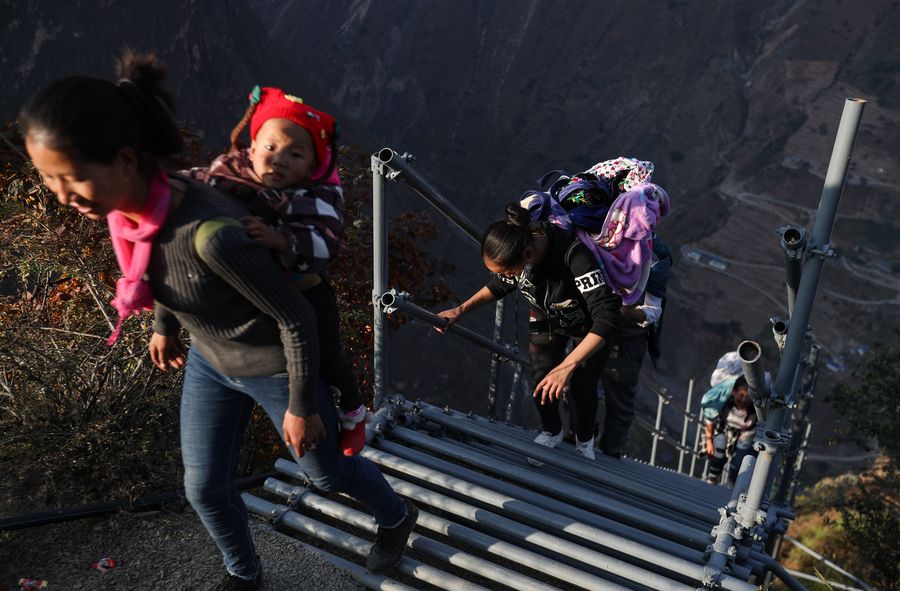 People of Yi ethnic group climb a steel ladder built along the cliff in Atulie'er Village, Zhaojue County, Liangshan Yi Autonomous Prefecture, southwest China's Sichuan Province, Nov. 24, 2019. (Xinhua/Jiang Hongjing)