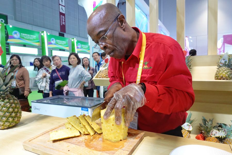 Visitors wait to taste a slice of pineapple from Panama at Food and Agricultural Products exhibition area during the second China International Import Expo (CIIE) in Shanghai, east China, Nov. 9, 2019. (Xinhua/Cai Yang)