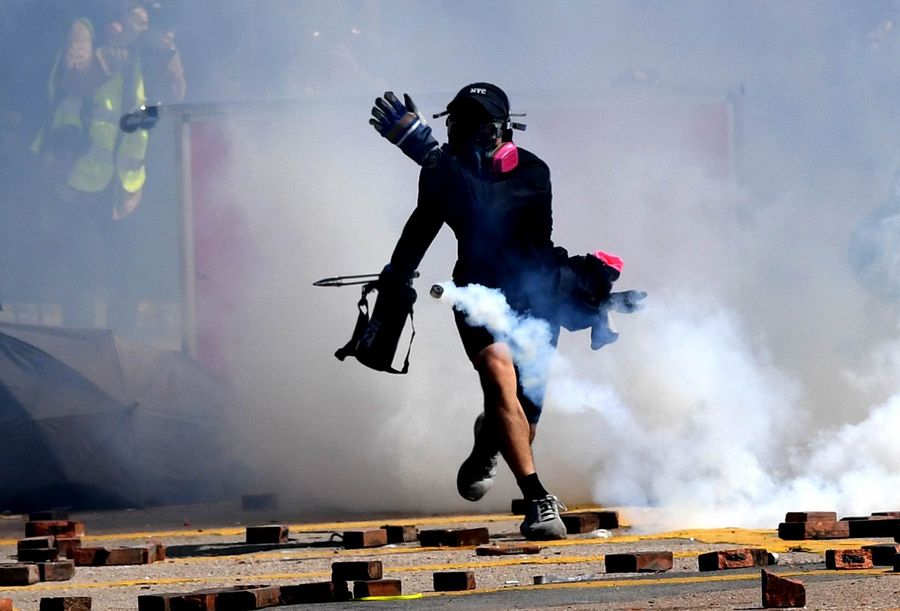 A rioter throws tear gas outside the Hong Kong Polytechnic University in south China's Hong Kong, Nov. 17, 2019. (Xinhua)
