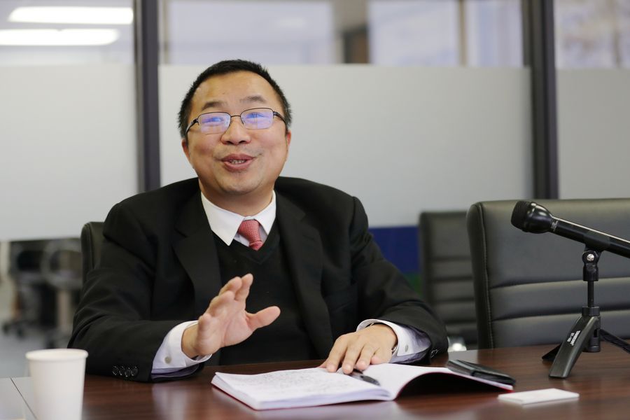 Ken Chen, CEO of HAND Enterprises Solutions USA Inc., speaks during an interview with Xinhua at his office in the suburb of Detroit, the United States, Nov. 14, 2019. (Xinhua/Wang Ping)