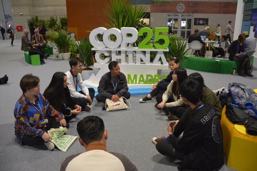 Students talk about measures to protect environment during the 25th session of the Conference of the Parties (COP25) to the UN Framework Convention on Climate Change in Madrid, Spain, on Dec. 4, 2019. (Xinhua/Feng Junwei)