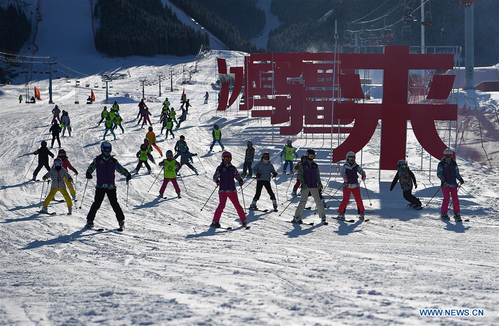 Contestants ski during the Urumqi Silk Road Ice & Snow Festival in Urumqi, northwest China's Xinjiang Uygur Autonomous Region, Dec. 23, 2019. The 17th Urumqi Silk Road Ice & Snow Festival opened Monday in Urumqi, and will last till April of 2020. (Xinhua/Song Yehua)