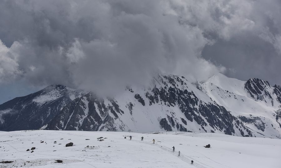 Participants travel towards Mt. Gangshika in a training session ahead of the 2019 world ski mountaineering masters Mt. Gangshika in Menyuan County, northwest China's Qinghai Province, May 23, 2019. (Xinhua/Wu Gang)