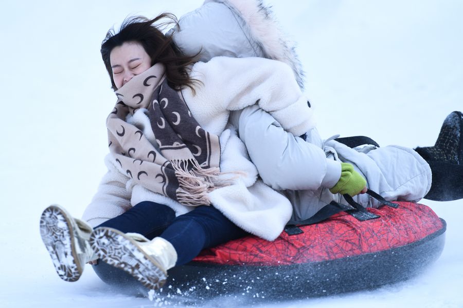 Tourists play with snow tubing in Xining, capital of northwest China's Qinghai Province, Dec. 26, 2019. (Xinhua/Wu Gang)