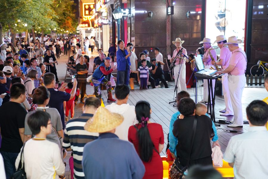 Band performances are a regular occurrence along Central St, Harbin, and they attract scores of locals and visitors alike. Photo by Wang Jianwei/Xinhua