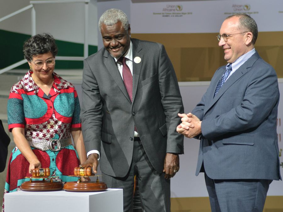 Chairperson of the African Union (AU) Commission Moussa Faki Mahamat (C) announces the operational phase of the African Continental Free Trade Area (AfCFTA) Agreement during the launching ceremony in Niamey, Niger, July 7, 2019. (Str/Xinhua)