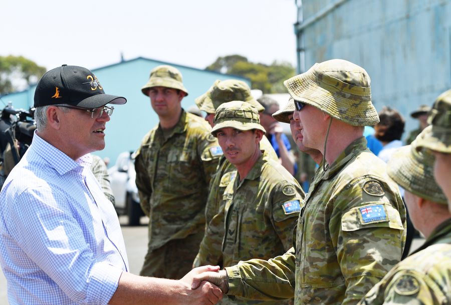 Australian Prime Minister Scott Morrison (L) greets troops as he visits an army water purification station at Kingscote Jetty on Kangaroo Island, Australia, Jan. 8, 2020. (EPA/Xinhua)