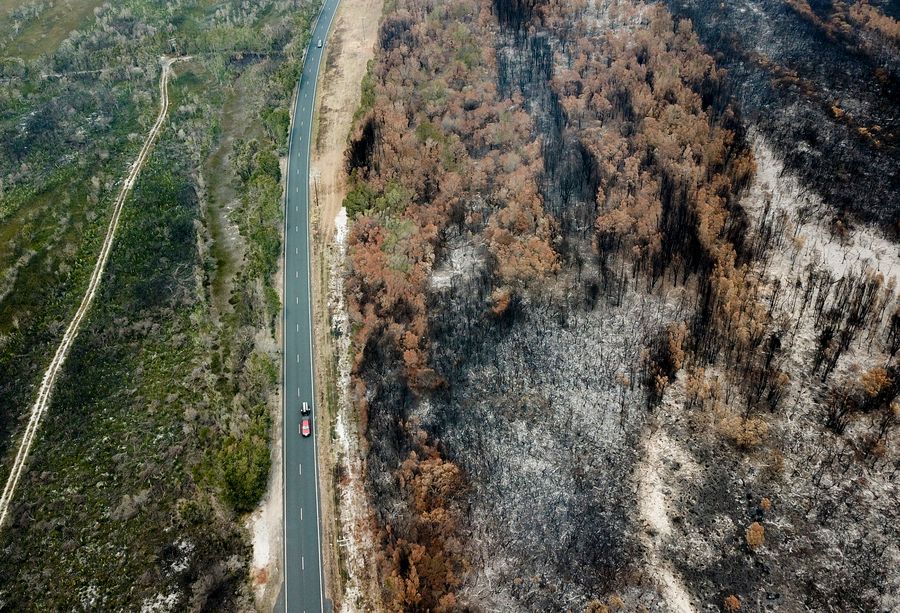 Aerial photo taken on Nov. 11, 2019 shows burnt bushes near Port Macquarie, New South Wales, Australia. (Xinhua/Bai Xuefei)