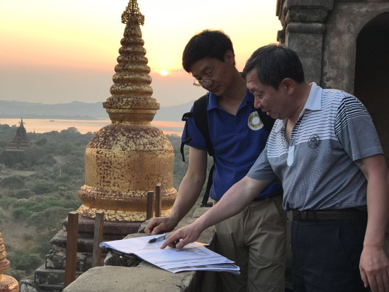 Li Bingnan and his colleague discuss the restoration plan in Bagan, Myanmar. (Photo provided to Xinhua)