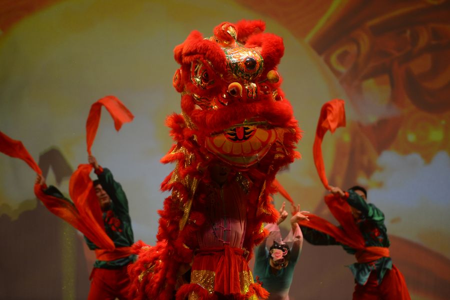 Artists perform lion dance during a performance celebrating the upcoming Chinese Lunar New Year at the Mediterranean Conference Centre in Valletta, Malta, Jan. 19, 2020. (Photo by Jonathan Borg/Xinhua)