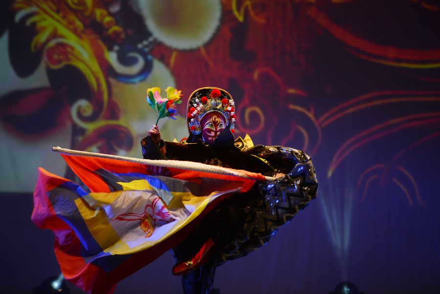 An artist performs Sichuan Opera face-changing during a performance celebrating the upcoming Chinese Lunar New Year at the Mediterranean Conference Centre in Valletta, Malta, Jan. 19, 2020. (Photo by Jonathan Borg/Xinhua)