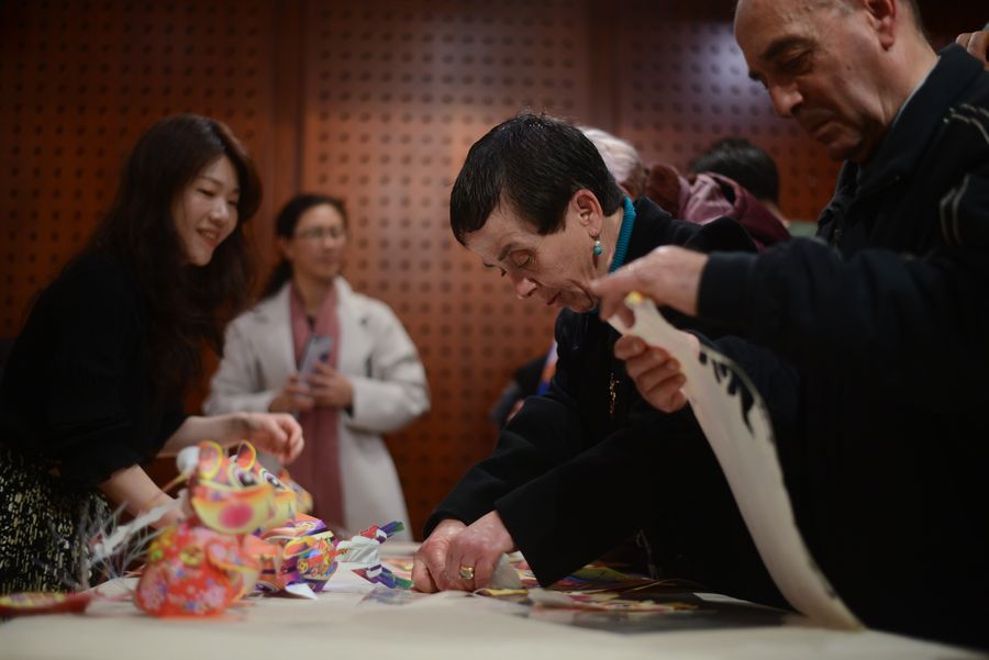 A visitor learns to make the Spring Festival decorations during an exhibition at the China Cultural Center in Malta on Jan. 17, 2020. (Photo by Jonathan Borg/Xinhua)