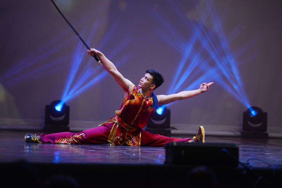 An artist performs Chinese Kongfu during a performance celebrating the upcoming Chinese Lunar New Year at the Mediterranean Conference Centre in Valletta, Malta, Jan. 19, 2020. (Photo by Jonathan Borg/Xinhua)