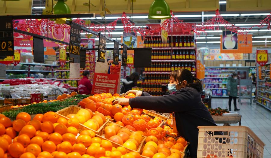 A staff member arranges fruits at a supermarket in Qingshanhu District of Nanchang, east China's Jiangxi Province, Jan. 30, 2020. (Xinhua/Hu Chenhuan)