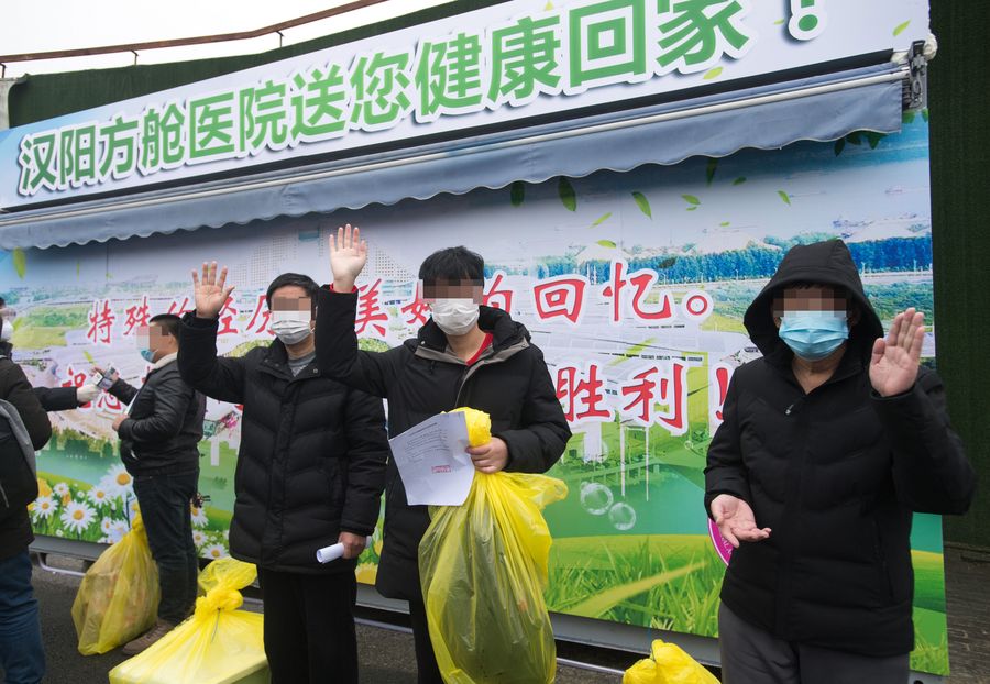 Recovered patients infected with novel coronavirus pneumonia (NCP) wave to medical staff at a temporary hospital in Wuhan, central China's Hubei Province, Feb. 21, 2020. (Xinhua/Xiao Yijiu)