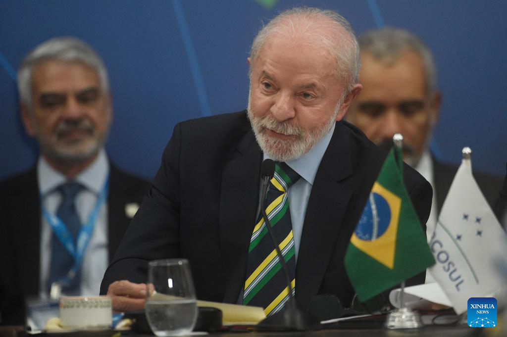 Brazilian President Luiz Inacio Lula da Silva speaks during the 67th Summit of the Heads of State of the Southern Common Market (Mercosur) in Foz do Iguacu, Brazil, on Dec. 20, 2025. The 67th Summit of the Heads of State of the Mercosur was held here on Saturday. (Photo by Lucio Tavora/Xinhua)
