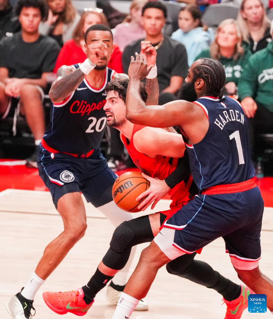 Deni Avdija (C) of Portland Trail Blazers breaks through past James Harden (R) of Los Angeles Clippers during the 2025-2026 NBA regular season match between Portland Trail Blazers and Los Angeles Clippers in Portland, the United States, Dec. 26, 2025. (Photo by Sun Yuxuan/Xinhua)