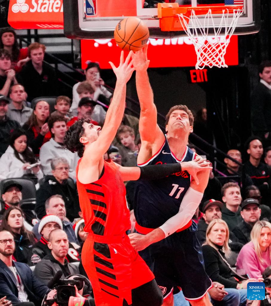 Brook Lopez (R) of Los Angeles Clippers blocks Deni Avdija of Portland Trail Blazers during the 2025-2026 NBA regular season match between Portland Trail Blazers and Los Angeles Clippers in Portland, the United States, Dec. 26, 2025. (Photo by Sun Yuxuan/Xinhua)