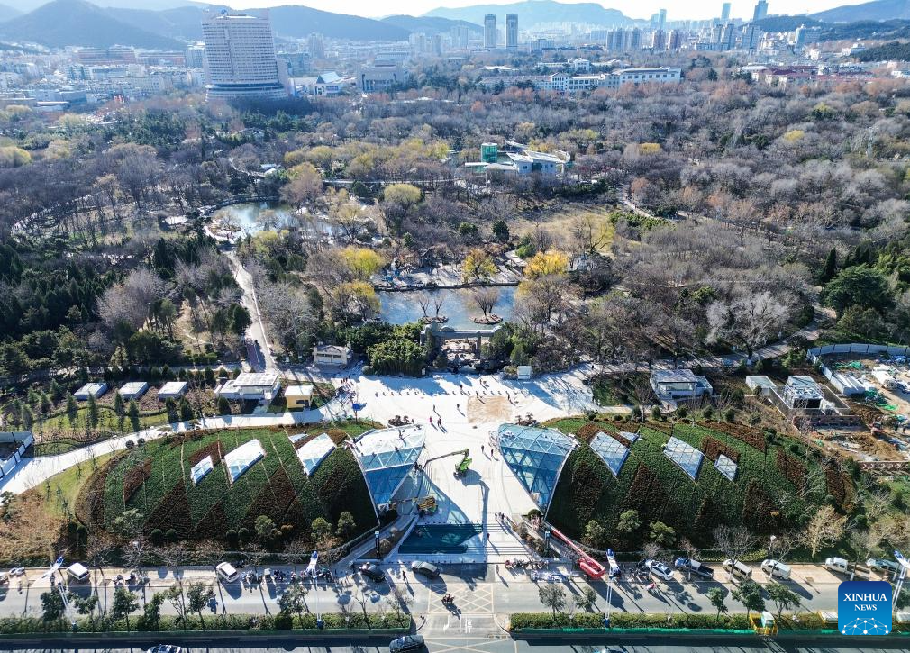This aerial drone photo taken on Dec. 25, 2025 shows the Quancheng Park Station of Jinan Subway Line 4, in Jinan, east China's Shandong Province. China's first subway line passing through a karst spring area began operation on Saturday in Jinan, marking an engineering breakthrough that balances urban transit demands with the protection of natural water resources.