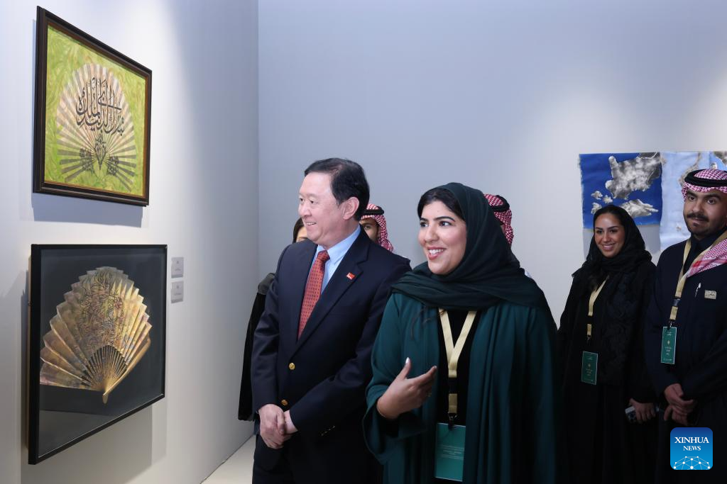 Saudi Deputy Minister of Culture Mai AlRasheed (R, front) and Chinese Ambassador to Saudi Arabia Chang Hua (L, front) visit Saudi-Chinese cultural festival in Riyadh, Saudi Arabia, Dec. 25, 2025. A Saudi-Chinese cultural festival opened this week in Riyadh, capping a year-long initiative aimed at strengthening ties between the two countries through art, technology, and heritage. (Xinhua/Wang Haizhou)