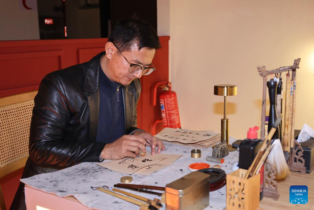 A Chinese folk artist displays calligraphy in Riyadh, Saudi Arabia, Dec. 25, 2025. A Saudi-Chinese cultural festival opened this week in Riyadh, capping a year-long initiative aimed at strengthening ties between the two countries through art, technology, and heritage. (Xinhua/Wang Haizhou)
