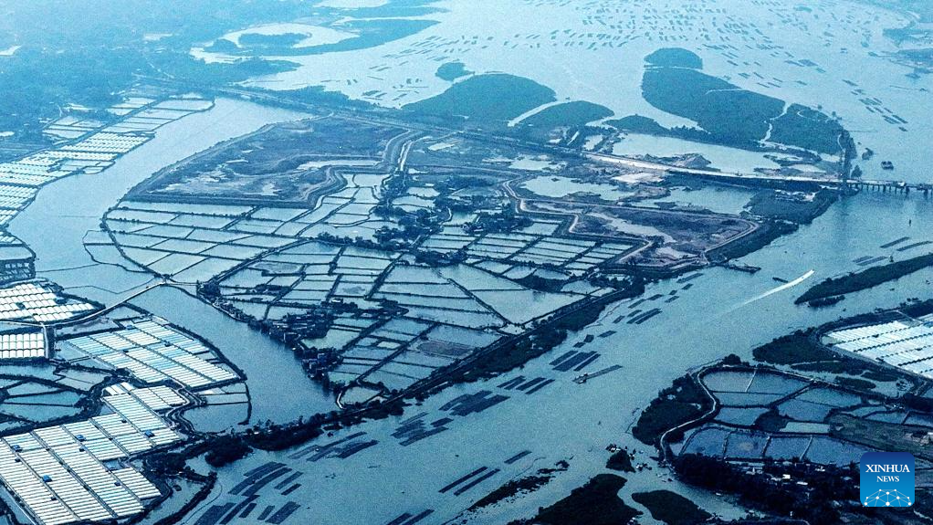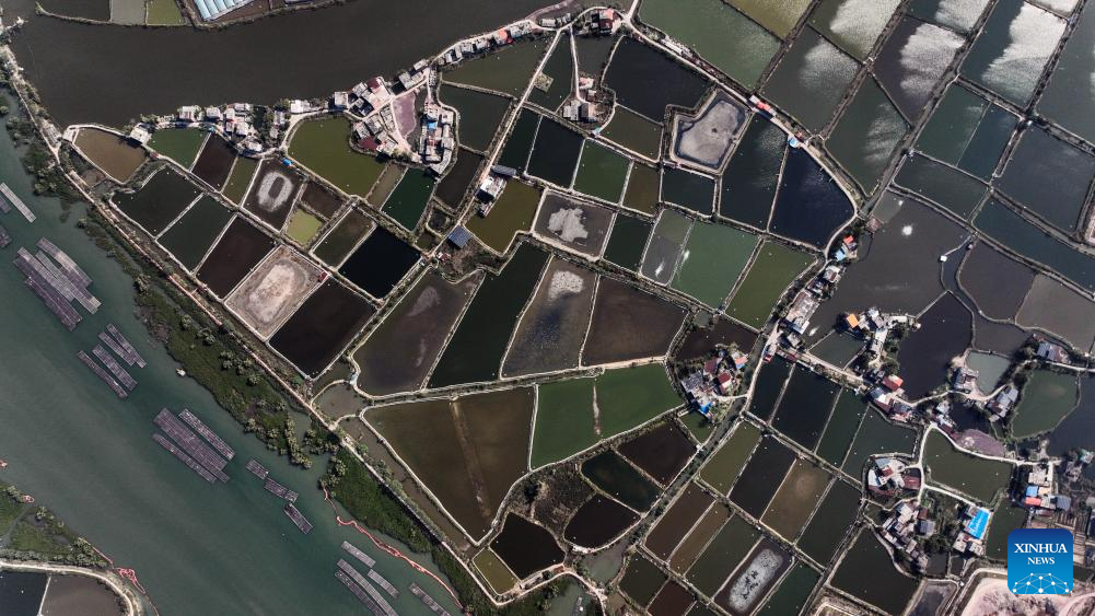 An aerial drone photo taken on Dec. 27, 2025 shows shrimp ponds in Qinzhou, south China's Guangxi Zhuang Autonomous Region. In winter, the Maowei Sea in Guangxi presents picturesque scenery. In recent years, Guangxi has implemented high-standard ecological protection of the marine environment in the Beibu Gulf, transforming the Maowei Sea into a new cultural and tourism landmark. (Xinhua/Zhang Ailin)