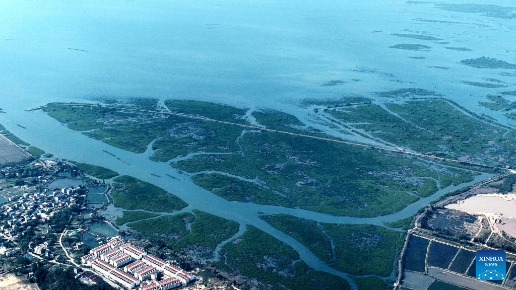 An aerial drone photo taken on Dec. 27, 2025 shows the estuary of the Pinglu Canal in Qinzhou, south China's Guangxi Zhuang Autonomous Region. In winter, the Maowei Sea in Guangxi presents picturesque scenery. In recent years, Guangxi has implemented high-standard ecological protection of the marine environment in the Beibu Gulf, transforming the Maowei Sea into a new cultural and tourism landmark. (Xinhua/Zhang Ailin)