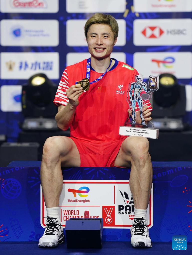 This file photo taken on Aug. 31, 2025 shows Shi Yuqi celebrating during the awarding ceremony for the men's singles event at the BWF World Championships 2025 in Paris, France. (Xinhua/Peng Ziyang)